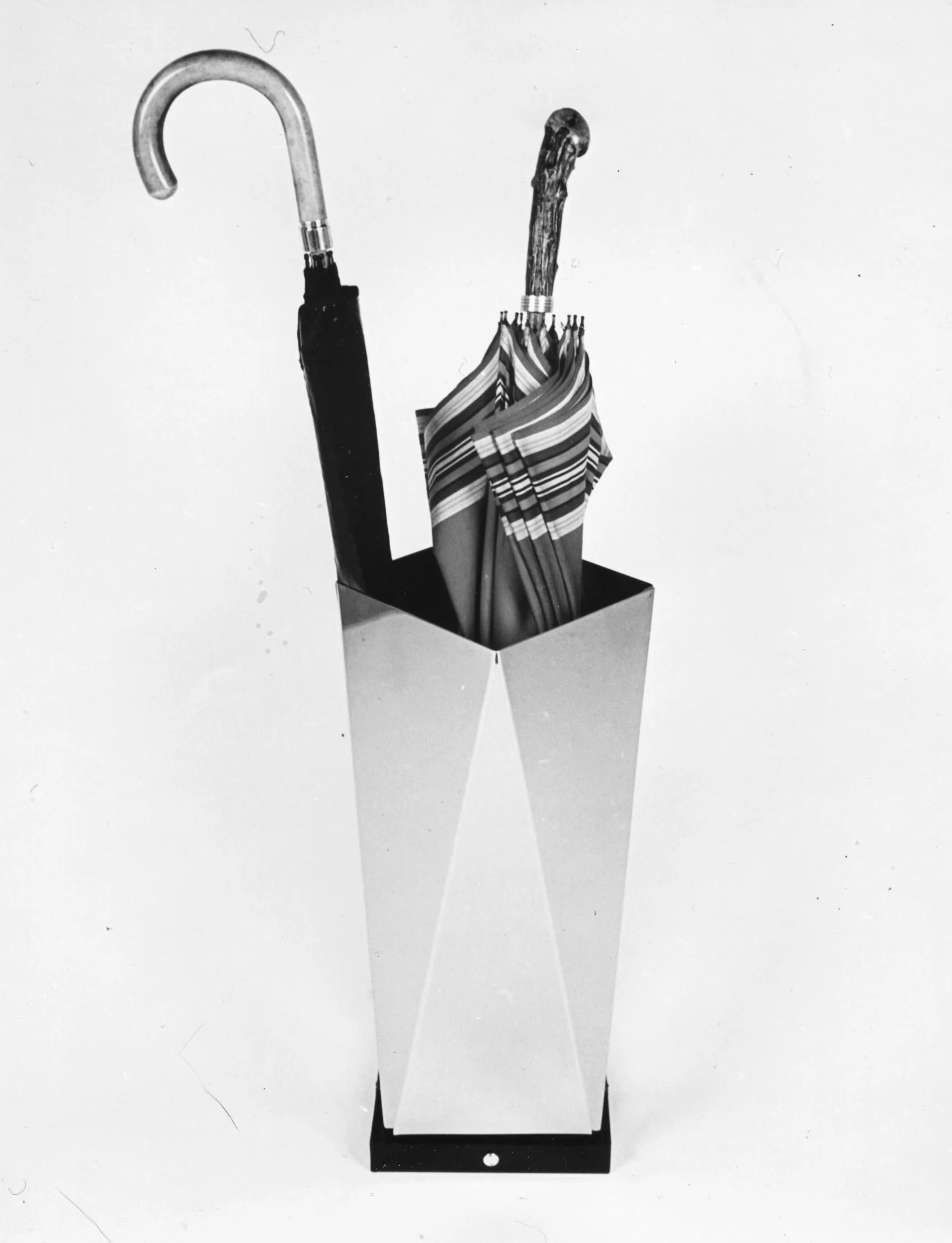 Sempre per Robots, un altro complemento d’arredo in acciaio inossidabile piegato: un portaombrelli che i commentatori definirono ‘scultoreo’. / Again for Robots, another piece of furniture in folded stainless steel: an umbrella stand that commentators defined as 'sculptural'.