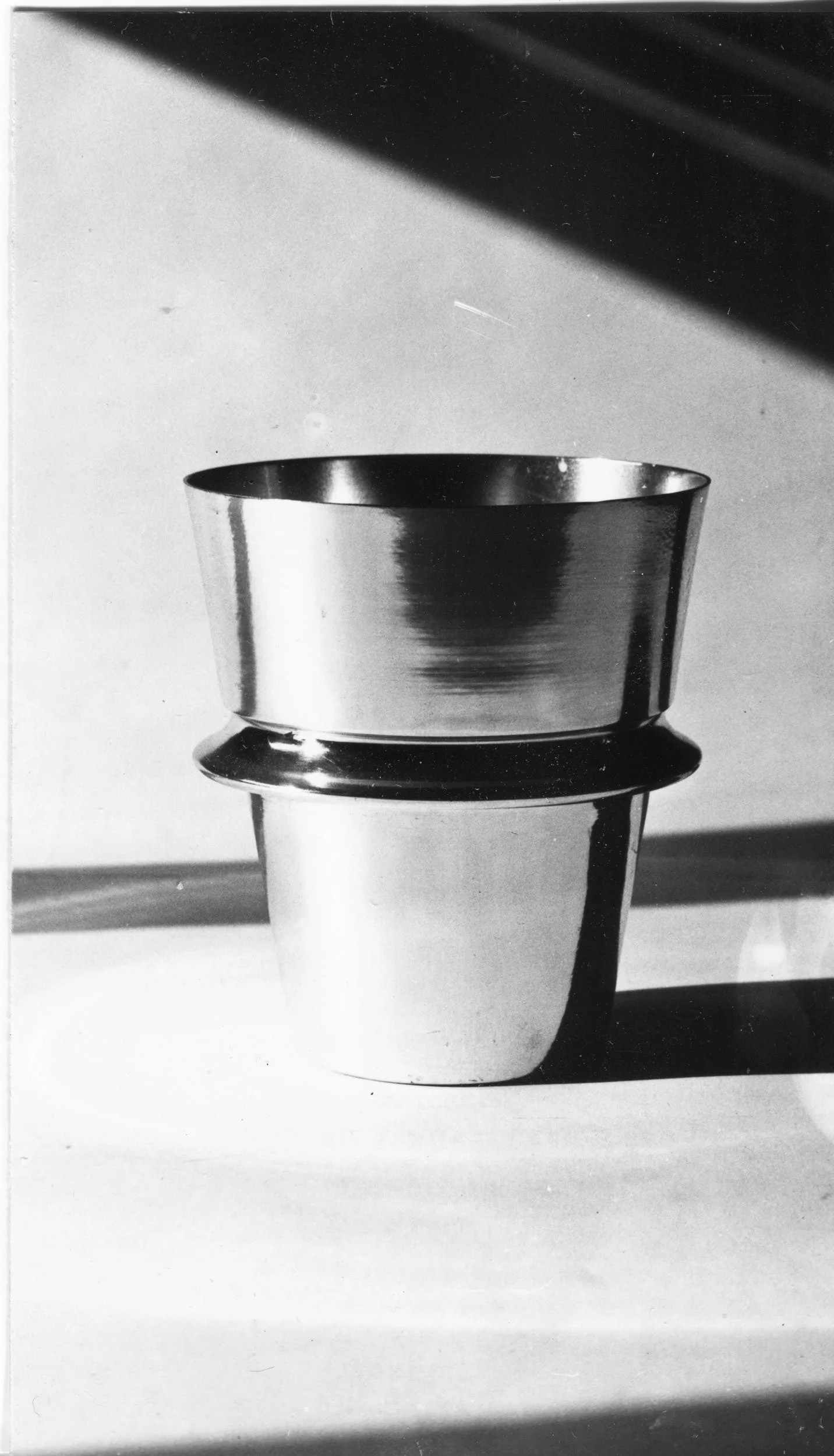 Un oggetto in lastra di rame tornita e argentata – vaso da fiori o secchiello da vino – che non è passato in produzione, ma è rimasto tra gli arredi della Casa dell’Architetto. / A design object in turned and silvered copper plate – flower vase or wine bucket – that did not go into production, but remained among the furnishings of the Architect's House.